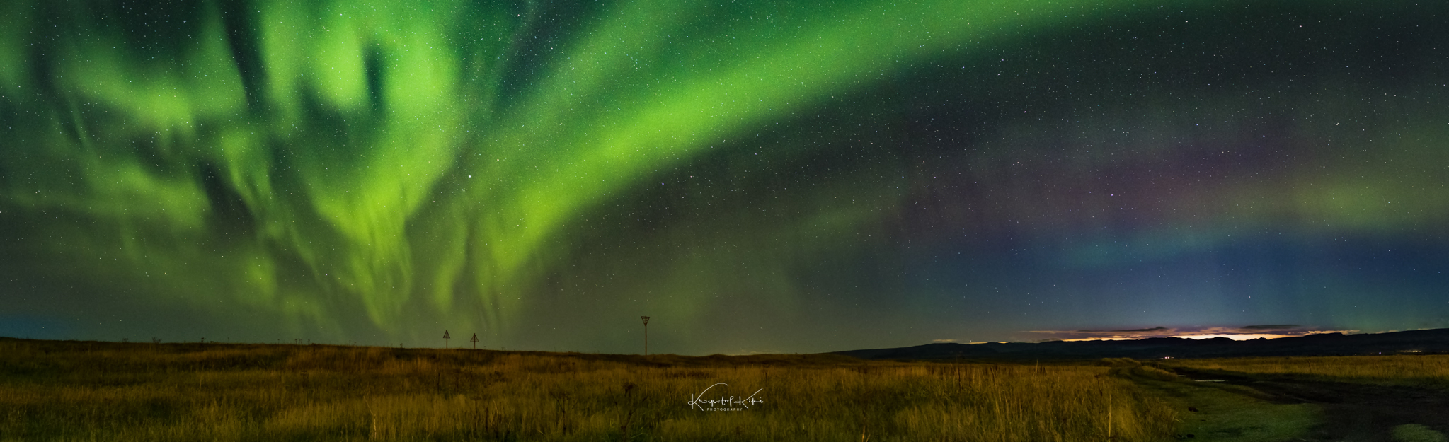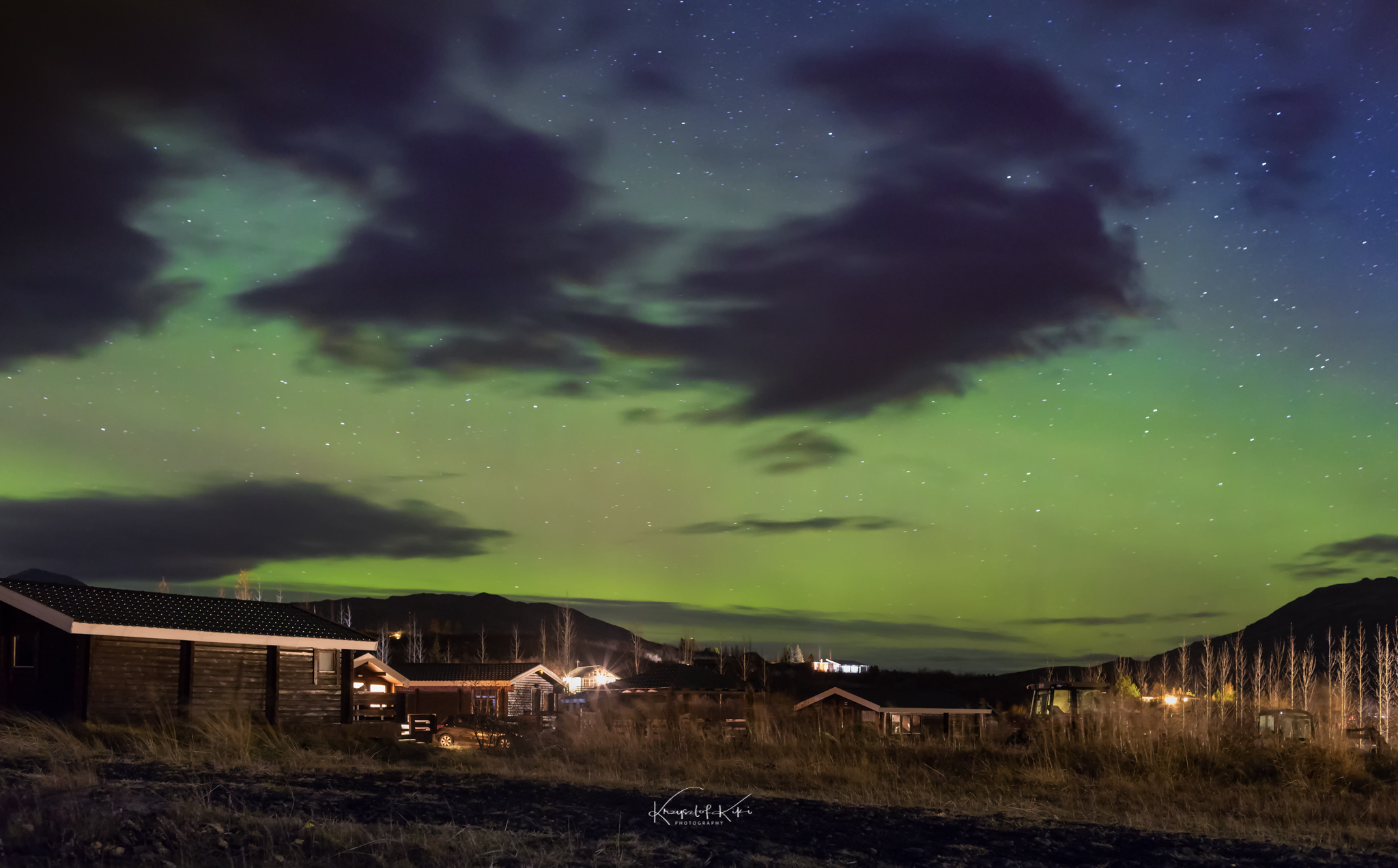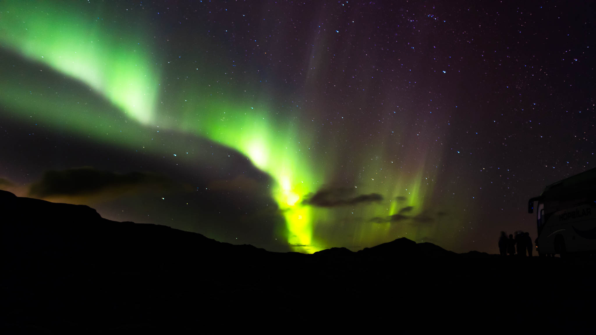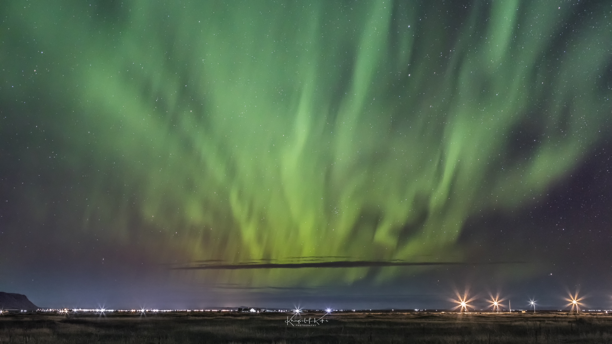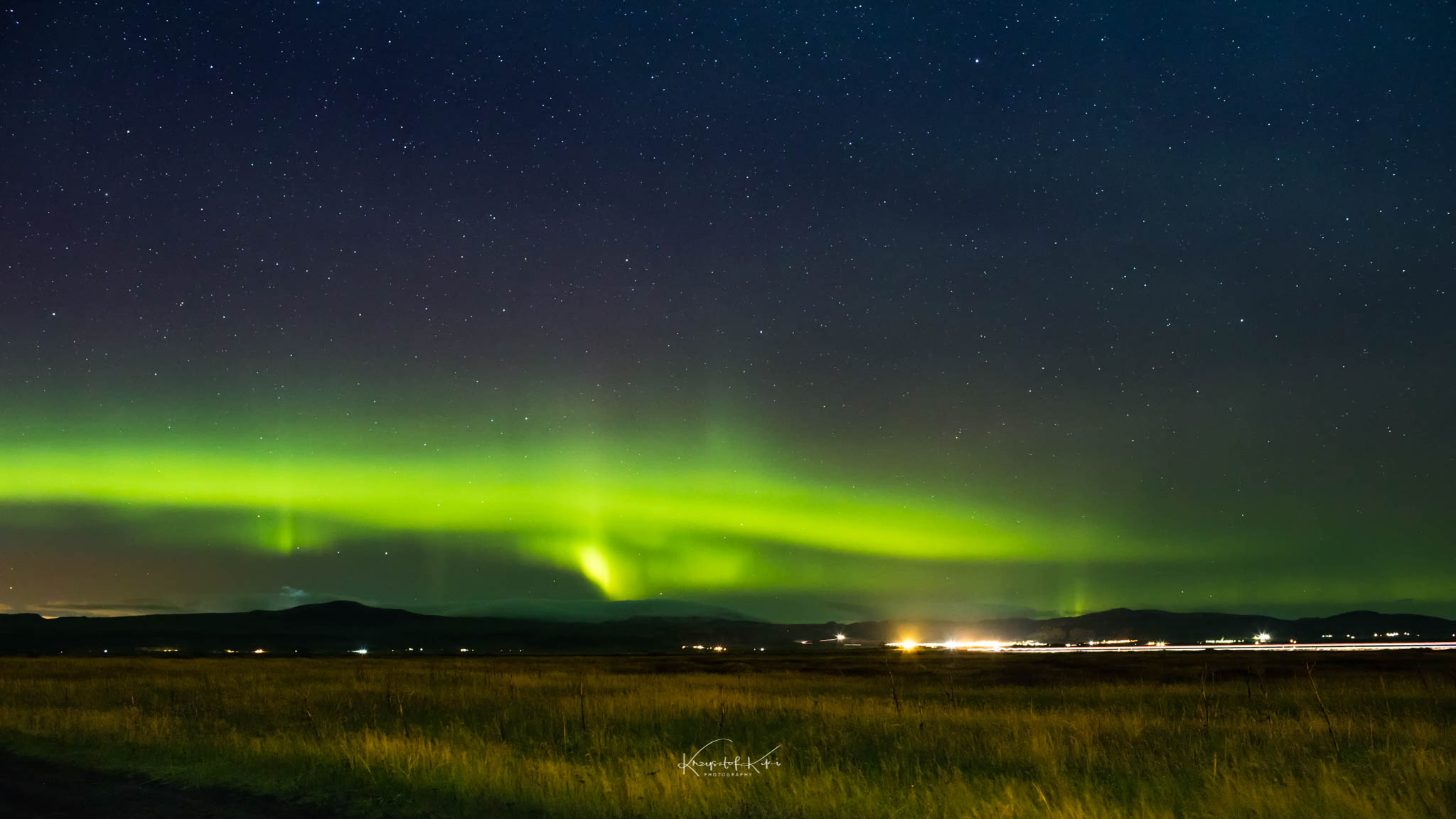 Sprzęt foto spakowany. Trochę ciuchów i coś do zjedzenia na te kilka dni. No jestem gotowy na wyjazd. To lecimy! Pierwszy etap to lot z Poznania do Warszawy. Tam przesiadka na drugi samolot już ten właściwy do Keflavíku. Port lotniczy Keflavík – największe lotnisko Islandii. Znajduje się on na półwyspie Reykjanes niedaleko Keflavíku, 50 km na zachód od Reykjavíku. Fajne nazwy miast no nie? Pierwsze chwile na tej wspaniałej wyspie kojarzyć mi się będą z zapachem siarki. Dziwny zapach na lotnisku! Ale co tam! Do wszystkiego można się przyzwyczaić. Ciemno i zimno. Na lotnisku wypożyczyliśmy trzy samochody i udaliśmy się w drogę na miejsce pierwszego noclegu. Oczywiście podczas drogi szukaliśmy na niebie okienka z widocznymi gwiazdami. Chmury, chmury i tylko chmury. Nic nie zwiastowało pogodnego gwieździstego nieba. Kilka kilometrów od Keflavíku podczas jazdy w zupełnych ciemnościach naszym oczom ukazała się pierwsza gwiazdka na niebie. Potem druga, trzecia i kolejna. Nagle naszym oczom ukazała się bardzo delikatna zielona poświata na niebie. Jest! To zorza? Tak! Szybka decyzja. Zjazd na pobocze. Wychodzę z samochodu i co widzę….? Ciemność a po chwili zorzę polarną witającą nas na Islandii. Pierwszego dnia. Po dwudziestu minutach podroży w tej ciemnicy udało nam się zaobserwować zorzę polarną. No no…… Zapowiada się mega ciekawa przygoda. Statyw przygotowany. Ustawiam aparat i…. pierwsze fotografie zorzy polarnej lądują na moich kartach pamięci. Jest super!